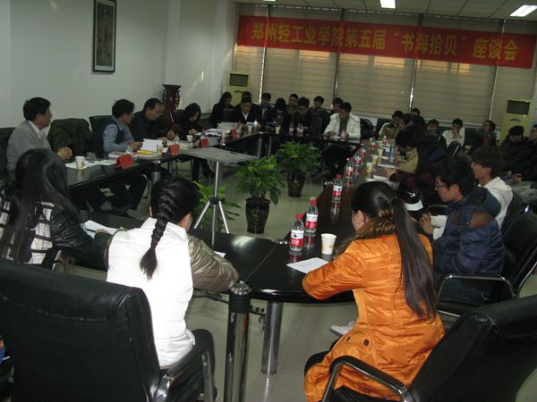 第五届“书海拾贝”师生读书座谈会于2014年12月18日下午,在图书馆第三会议室召开,副校长陈江风教授出席了座谈会,科技处处长王军教授、继续教育学院院长(合作办学管理处处长)王培义教授、团委赵灿鑫副书记、图书馆相关老师及40多名学生代表参加了座谈会。档案馆馆长兼图书馆副馆长蔡丽萍主持了座谈会。