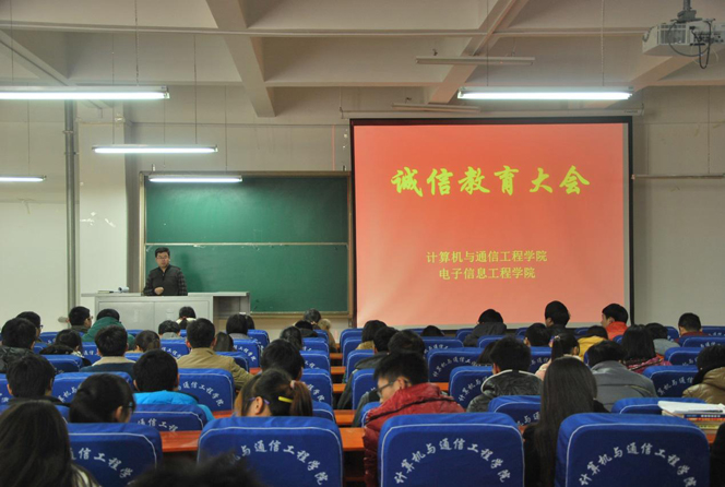 12月18日中午12:30,计算机与通信工程学院(电子信息工程学院)在计算机学院217召开诚信教育大会。党总支部副书记葛勋老师主持会议,学院全体辅导员以及各班级班委、寝室长参加此次会议。