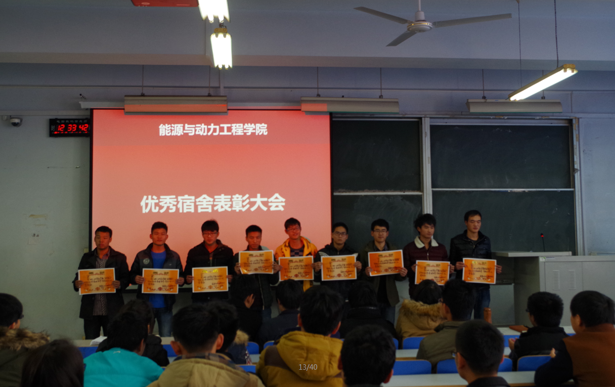 为进一步推进宿舍文化建设,丰富寝室文化内涵,促进同学们自觉营造整洁、舒适、健康的寝室环境,能源与动力工程学院在本学期开展了优秀宿舍评比活动。2014年12月29 日12:10,在东一楼300教室召开了表彰大会,学院分团委老师、各寝室学生代表参加。