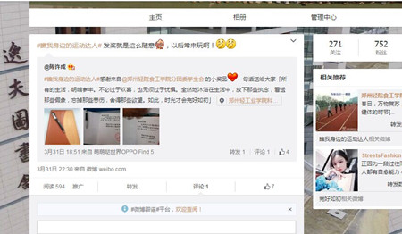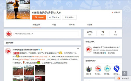 325日,我院通过分团委官方微博开设“瞧我身边的运动达人”微话题,鼓励全院同学参与,分享体育锻炼中的美好瞬间和快乐时刻,并根据转发及点赞数进行幸运评选活动,运用新媒体营造了青春健康快乐的校园氛围。