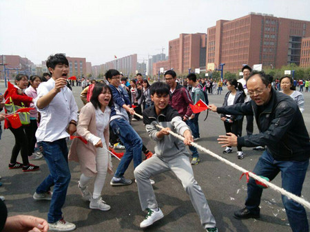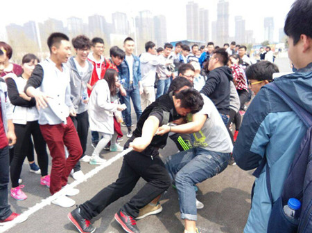 330日,我院组织2014级学生参加拔河比赛。队友们紧握绳子,力往一处使,心往一处聚。啦啦队在旁边为自己的班级加油助威。整个场面既激烈又激情四溢。本次比赛,烟草工程2014-1班获得冠军。