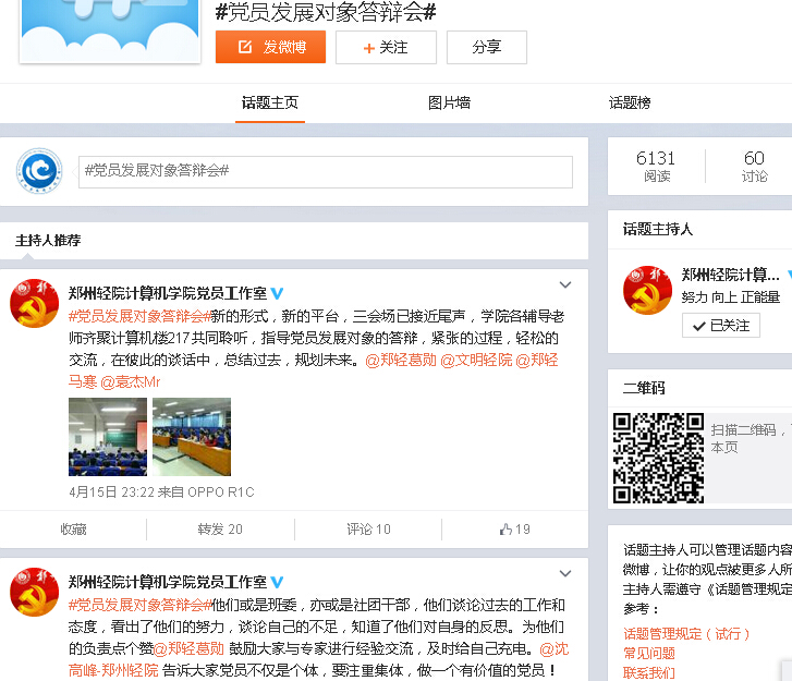 此次活动我院利用计算机与通信工程学院党员工作室官方微博以#党工微直播#、#党员发展对象答辩会#话题同步直播,得到学院学生积极关注,起到了较好的宣传思想引导作用。