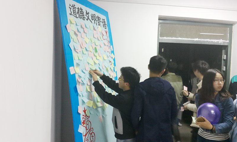 本次活动分为六个环节,“诵一部经典”环节,我院纪念“一二·九”运动诗歌朗诵比赛一等奖团队带来了《少年中国说》,诵读铿锵有力,诗句鼓舞人心;“看一段短片”环节,感动中国人物“移民书记”赵久富的故事感动着所有的人,他是共产党员的一面旗帜,爱党、爱民,舍小家、顾大局,讲责任、勇担当,在他身上,集中体现了社会主义核心价值观;“讲一个故事”环节,我院“幸福而快乐的残疾人”无臂男孩邵梦阳为大家讲述怀揣一颗感恩之心阳光面对生活的成长故事,他的勇敢、坚强、宽容、乐观让全场同学为之感动,大家在微博贴送上祝福:“送你一对翅膀,让你在天空翱翔!”、“坚强、感恩、别向命运屈服!”;“唱一首歌曲”环节,全场起立满怀感恩合唱一首歌——《时间都去哪儿了》,熟悉的旋律,感人的歌词,不少同学潸然泪下;“开展一次互动”环节,在座同学从亲身经历、生活感悟、身边故事等方面分别分享自己对道德理解与认识;“分享一份感悟”环节,全场同学在留言板和微博#走进‘道德讲堂’,传递正能量”#话题下留下自己的道德感悟和美好祝福,中华传统美德在同学中传递开来,现场气氛达到高潮。