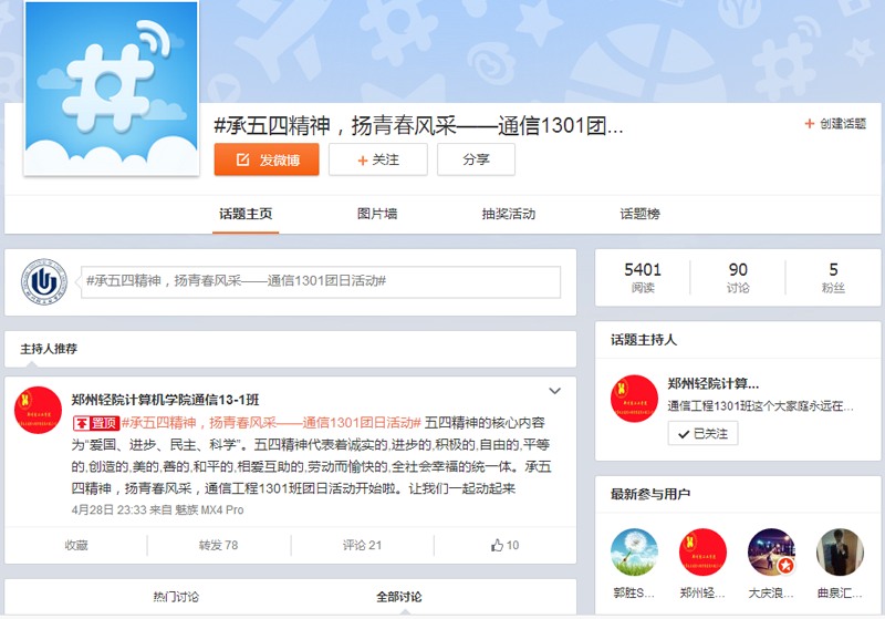 本次示范团日活动由我院获得校2014-2015学年十佳红旗团支部的通信工程13-1班团支部举办。中午12点,通信工程13-1班团支部全体成员和学院各团支部代表齐聚简洁而庄重的活动现场,由主持人宣布团日活动正式开始。首先,同学们起立,集体合唱共青团团歌《光荣啊,中国共青团》。接着优秀团员于楠同学进行了极富激情的诗朗诵《为祖国而歌》,在深情的朗诵声中,同学们受到了触动,眼眶泛红,纷纷报以热烈的掌声。随后,活动进入到五四运动和五四青年节知识竞答环节,同学们争先恐后,踊跃抢答。最后,大家观看了五四运动的相关视频,重温了那一段光荣的历史。在活动现场,我们开展了微博话题互动抽奖活动,在场的同学们纷纷登录新浪微博并关注:郑州轻院计算机学院通信工程13-1班,参与话题#承五四精神,扬青春风采通信工程13-01班主题示范团日活动#,转发该话题的置顶微博参与抽奖。