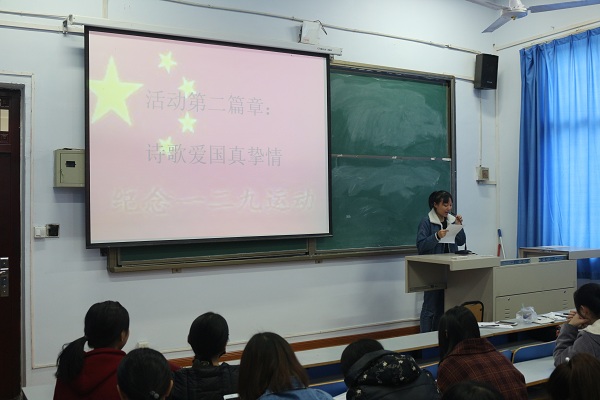 活动伊始,大家一同观看了《大抗战之纪念一二•九》视频,以全新的视角再现了一二•九活动的历史全貌。随后,英语17-1班团支书李畅通过PPT,讲述了一二•九运动的背景和影响,向同学们还原了真实的历史事件,赞扬了爱国青年的爱国主义情怀,同时勉励大家要把个人的命运与祖国的命运直接联系起来,把自己的人格与祖国的国格直接联系起来,为中华之崛起而读书。交流环节,同学们结合十九大和习近平总书记系列重要讲话精神各抒己见,表达出自己对爱国精神的领悟,并提出具体的爱国举措。活动现场气氛热烈,同学们纷纷表达对革命青年由衷的敬意。