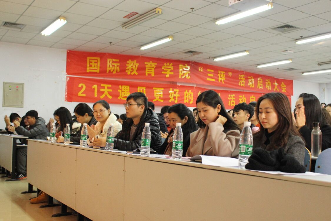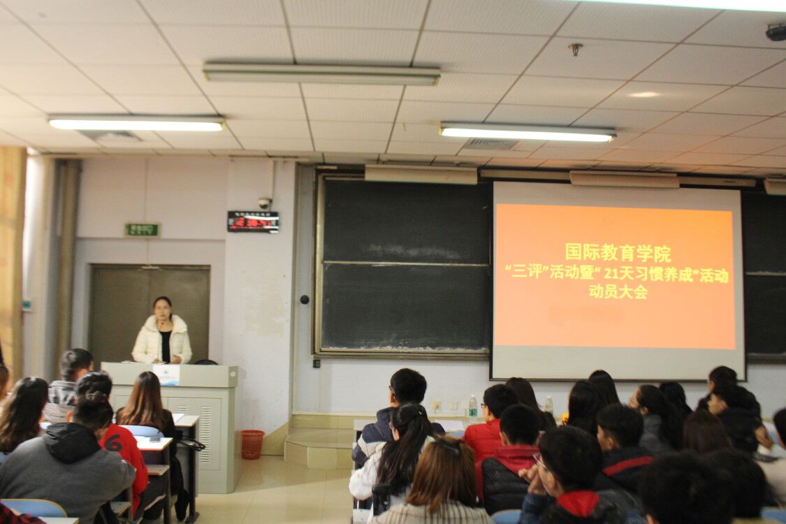 12月4日中午12:40,国际教育学院“团组织评星定级、团员评星创先、团干部评星争优”工作暨“21天遇见更好的自己”习惯养成活动动员部署大会在教三楼104举办,国际教育学院党总支副书记李锐杰老师、分团委书记张瑞凤老师、专兼职辅导员出席了大会,各年级学生党员、班长、团支书等主要学生干部参加了本次大会。