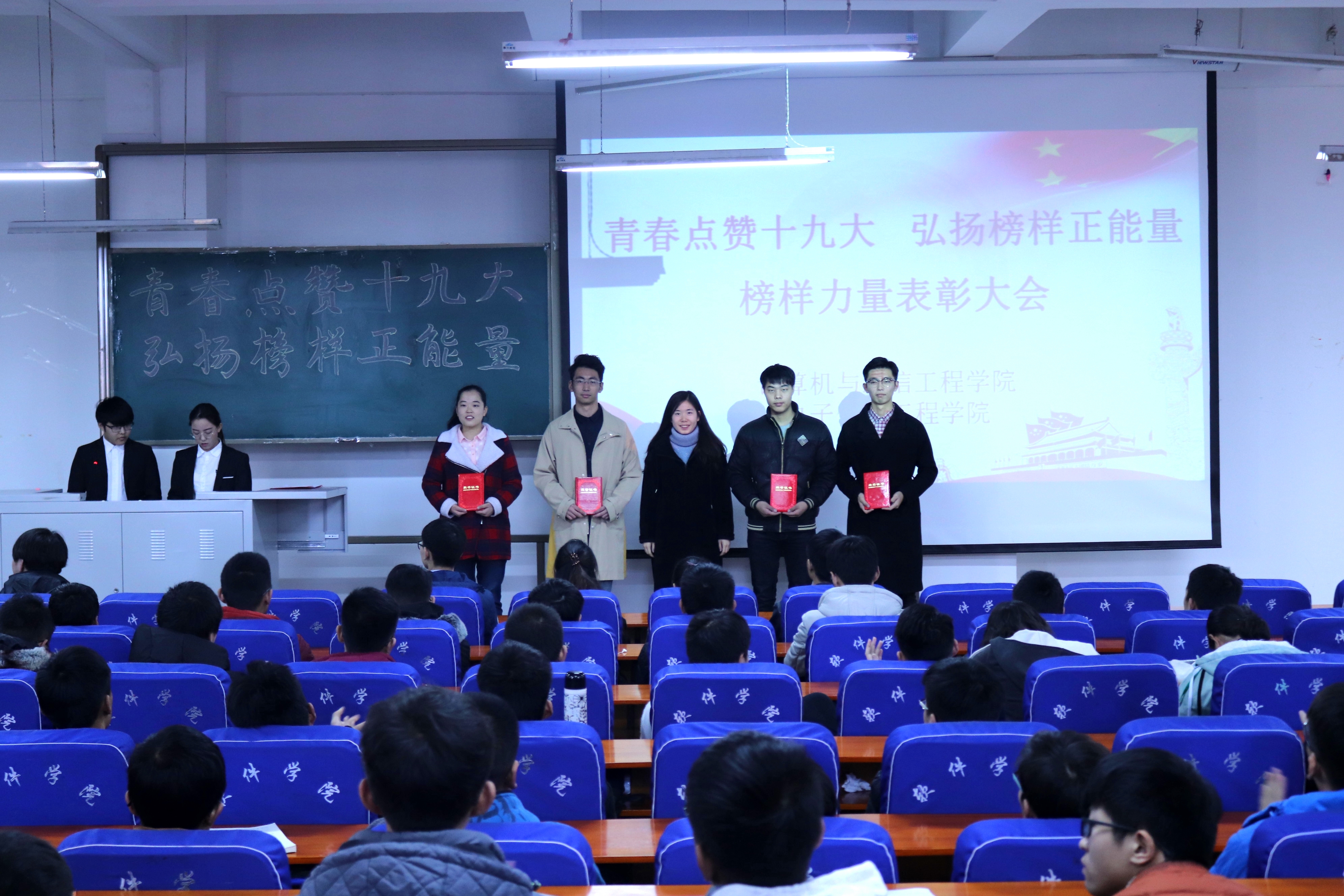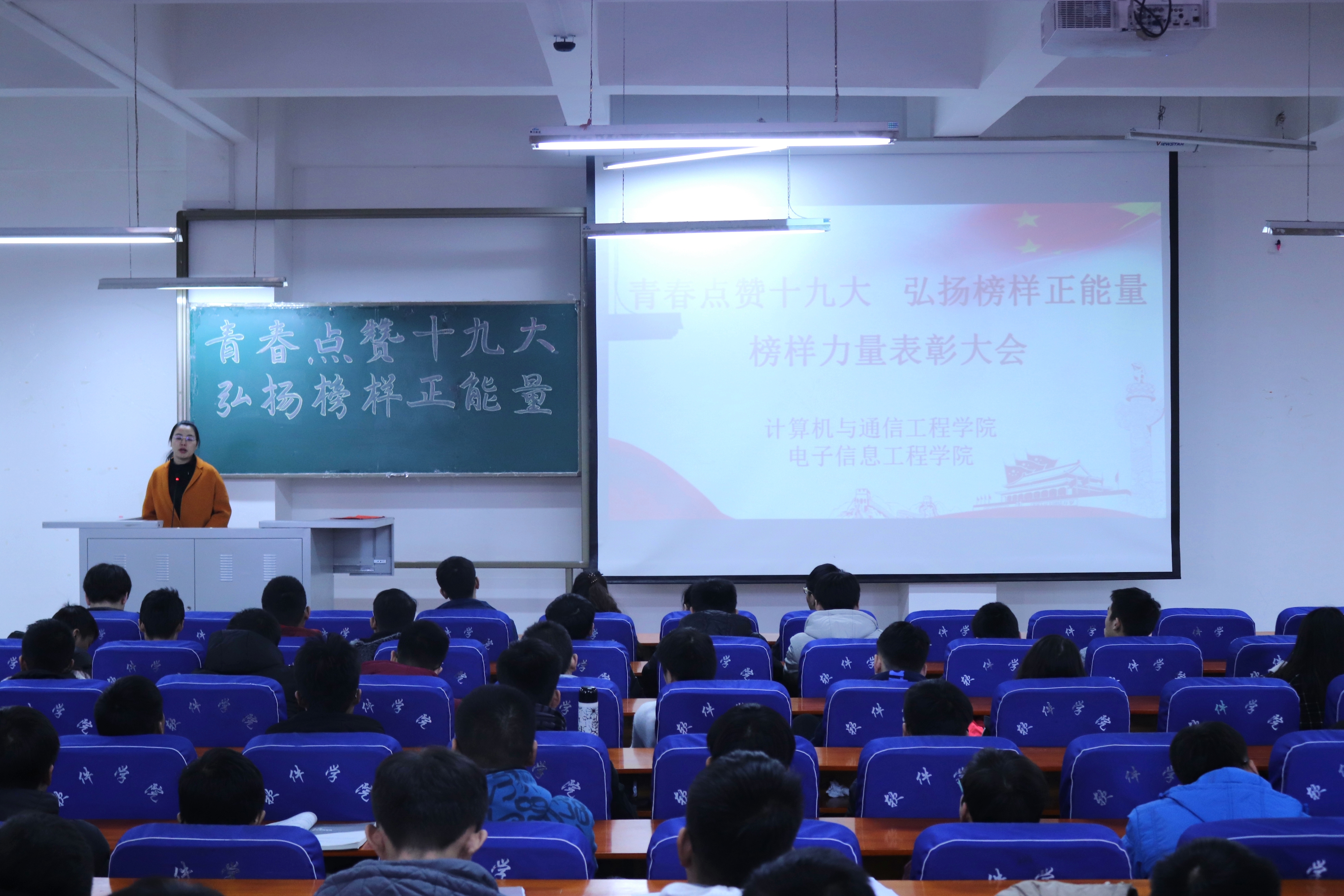 为进一步提升基层团支部活力,充分发挥大学生榜样作用,传递青春榜样正能量。计算机与通信工程学院(电子信息工程学院)于12月8日中午12点20在计算机楼219举办以“青春点赞十九大弘扬榜样正能量”为主题的榜样力量表彰大会。辅导员孟牒老师、艾怡静老师、学院分团委全体成员、16级及17级学生代表共200余人参加了大会。