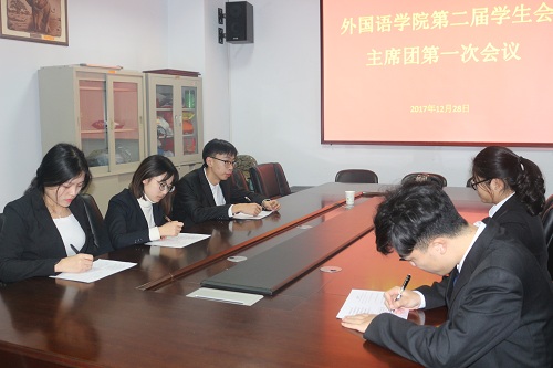 会后,在东二楼306会议室,召开了郑州轻工业学院外国语学院第二届学生会主席团一次会议,选举产生了新一届学生会主席、副主席、秘书长,会议同时对下一阶段的工作进行了全面部署。