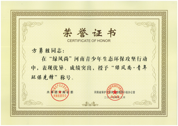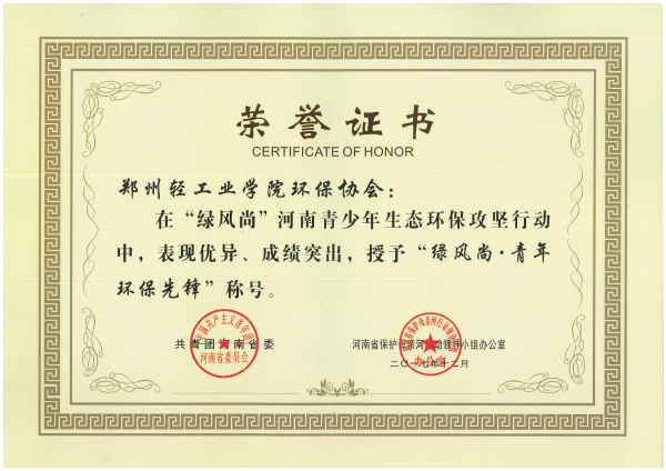 “绿风尚”河南青少年生态环保攻坚行动开展以来,我校各级团学组织和广大团员青年以习近平新时代中国特色社会主义思想为指引,贯彻落实党的十九大精神,积极投身环保活动,立足我省、我校实际,积极参与环境生态治理,传播绿色理念、践行绿色生活、培育绿色队伍、建设绿色工程,期间涌现了一大批优秀团学青年和团队典型,按照《关于开展“绿风尚”河南青少年生态环保攻坚行动的通知》(豫青联字(2017)18号)文件要求,我校择优选拔和推荐在“绿风尚”河南青少年生态环保攻坚行动中表现突出的多个优秀团体和个人参加了评选活动,最终我校环保协会荣获优秀团体、方勇胜同学荣获优秀个人。
