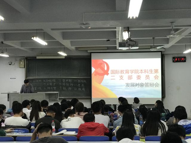 促进党建工作标准化建设,切实提高学生党员发展质量,国际教育学院各学生党支部于3月27日至3月29日分别召开了各支部2017-2018学年第二学期党员发展对象候选人选演讲答辩会,各学生支部书记、全体辅导员老师、学生党员代表和入党积极分子学生代表参加了本期的答辩会。