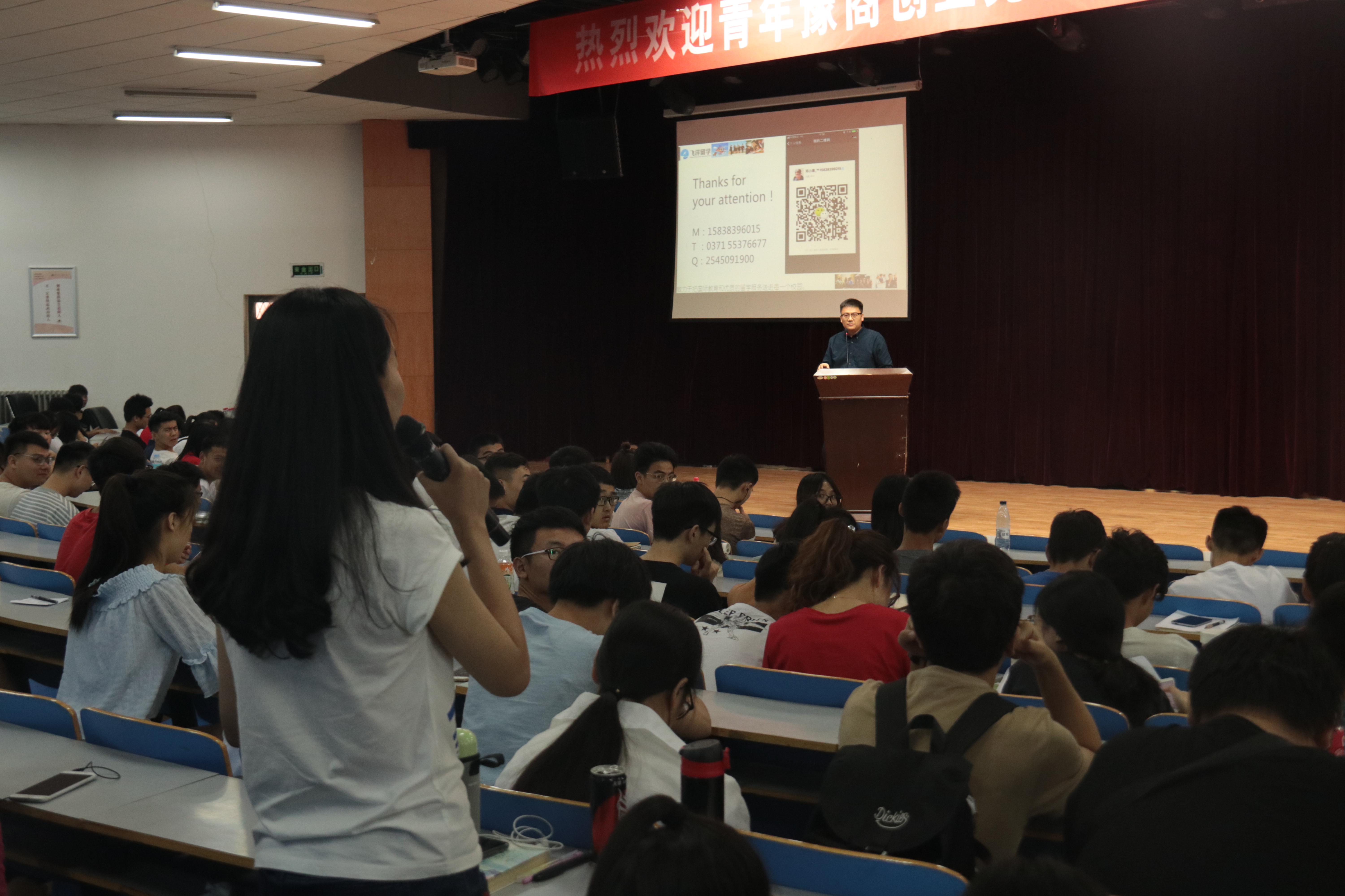 6月14日下午,由共青团河南省委、河南省学生联合会主办,河南豫商联合会、郑州轻工业学院团委承办的“创新创业大讲堂---2018年青年豫商创业先锋人物走进高校”活动在郑州轻工业学院学生活动中心208举行,活动邀请了河南中盟地产有限公司董事长刘鹏阁女士、河南飞洋出国留学服务有限公司总经理邓小康先生作报告,学校近500名怀揣创业梦想的学子参加了本次活动。