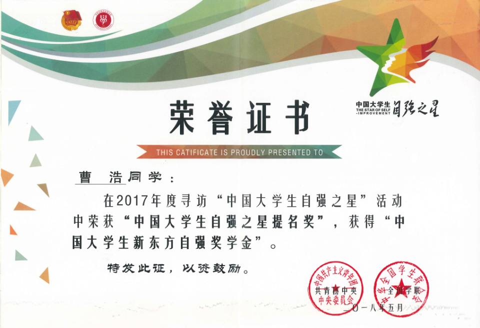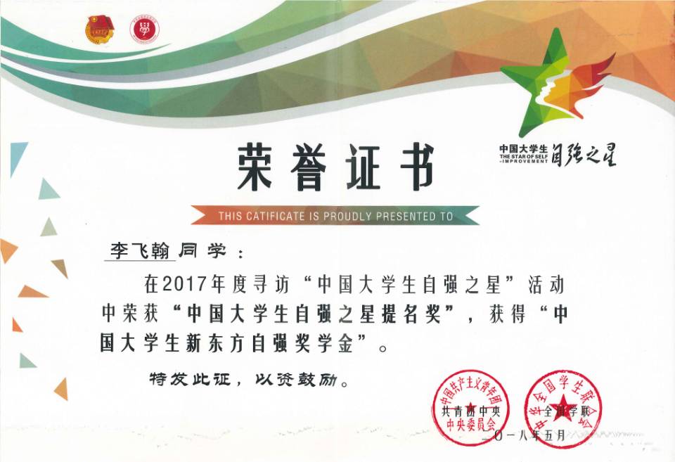 近日,由共青团中央、全国学联主办,中国青年报社、中国高校传媒联盟承办的2017年度寻访“中国大学生自强之星”活动评选结果揭晓,我校材料与化学工程学院李飞翰同学、机电工程学院曹浩同学双双荣获“中国大学生自强之星提名奖”并获得“中国大学生新东方自强奖学金”。