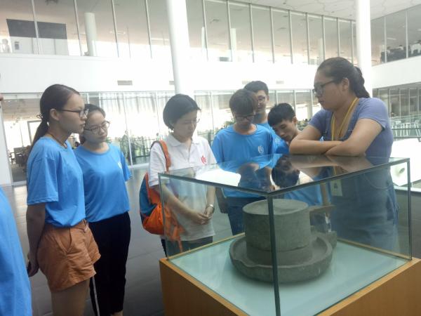工作人员讲解三全创始人用的小石磨 |  |