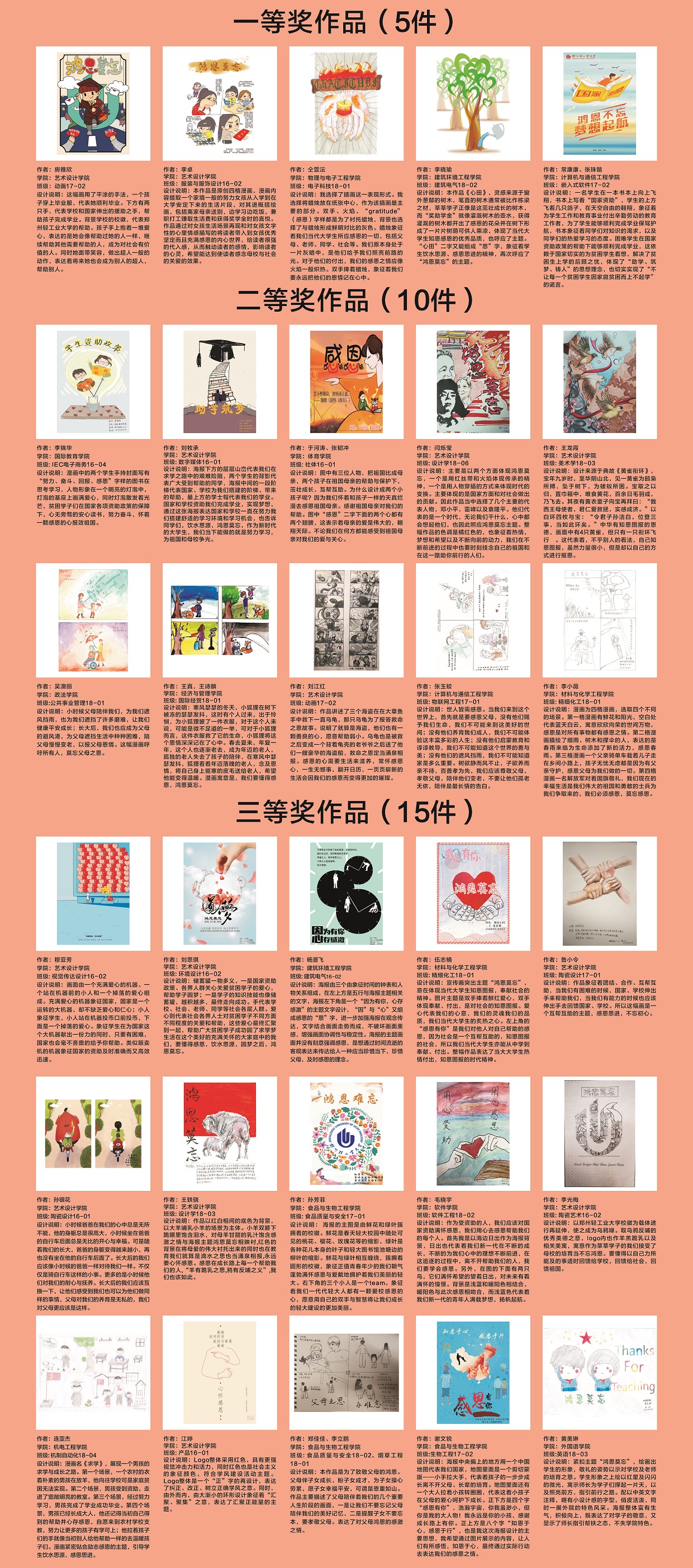 本次大赛得到了各学院学生的积极参与,共收到各学院选送的参赛作品400余件。参赛作品大多设计简洁明朗,寓意贴切,体现出当代大学生知恩感恩的优秀品质。经专家评审,共评选出一等奖作品5件,二等奖作品10件,三等奖作品15件,优秀奖作品20件,优秀组织奖3个。对本次大赛涌现出的优秀作品,以作品展的形式在新老校区进行了集中展示,吸引了众多师生驻足观赏,得到了大家的一致好评。