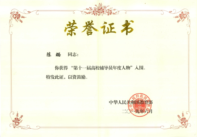 全国高校辅导员年度人物评选活动从2008年开始,迄今已举办了十一届,是辅导员规格最高、最为权威的工作业绩评比。来自全国各高校的优秀辅导员们在这个舞台上展现着各自的风采与独到的工作经验和方法,此次评选旨在推动全国高校落实立德树人根本任务,培育践行社会主义核心价值观,大力培养选树新时代高校辅导员先进榜样,充分展示新时代高校辅导员群体昂扬向上的精神风貌。评选活动4月份启动以来,我校积极参与候选人推选和申报工作,在校内形成了关注、支持、参与推选活动的良好氛围。经河南省教育厅专家评审,全省共推荐包括我校陈璐老师在内的6名高校辅导员参加了全国的推选活动。经过组织推荐、通讯匿名评审、实地考察等环节,陈璐老师最终获得全国“第十一届高校辅导员年度人物”入围奖。