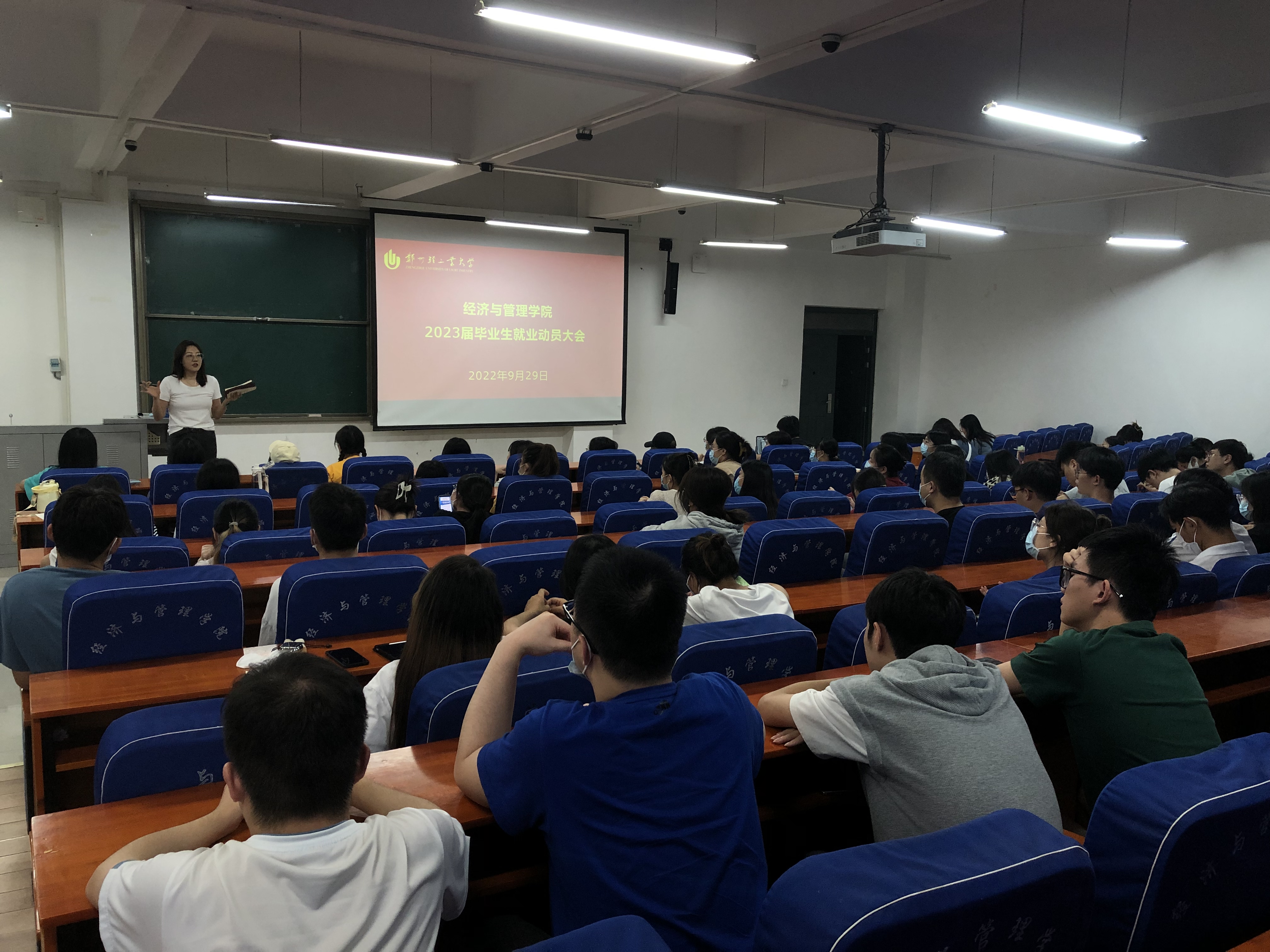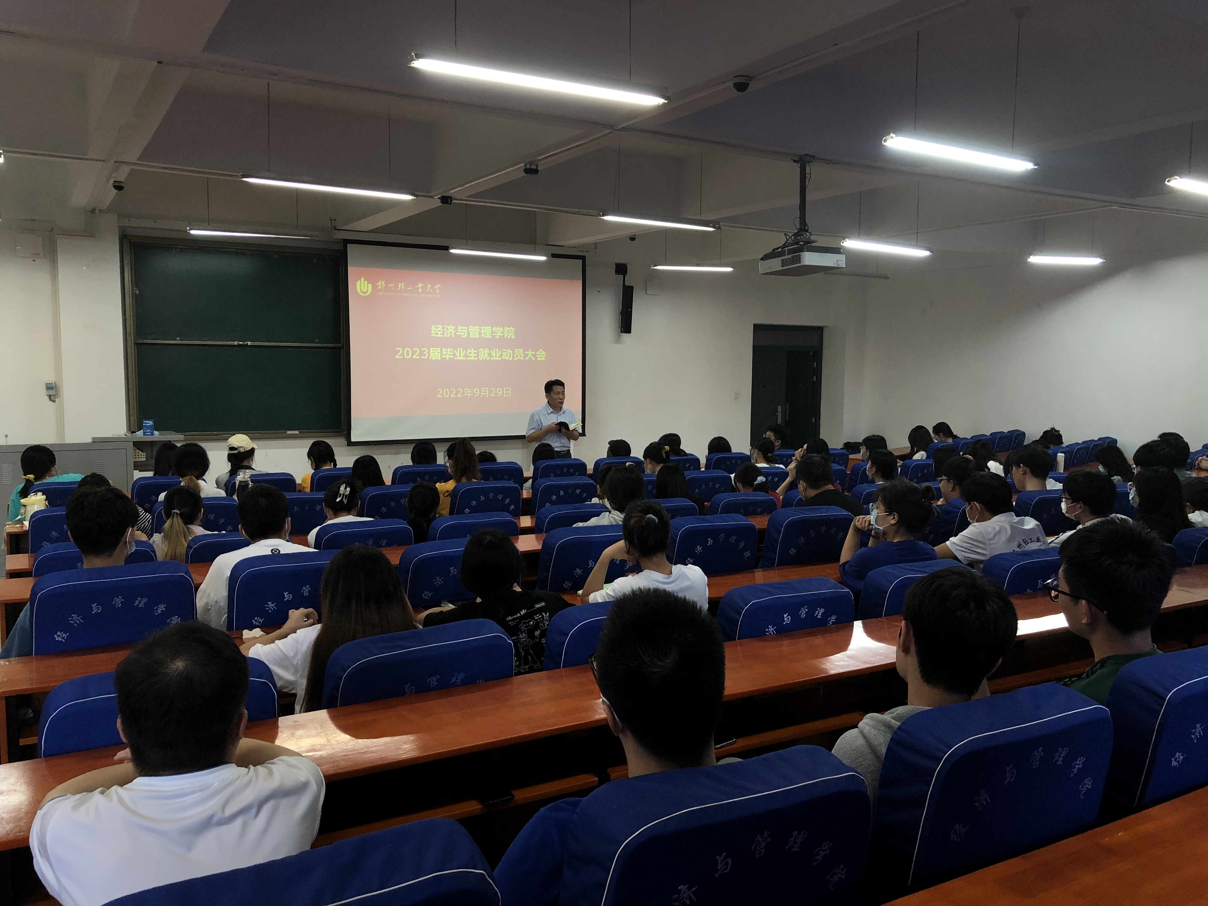 为进一步增强毕业生就业意识,引导毕业生了解就业形势,树立正确的就业观和择业观,9月29日至10月23日,经济与管理学院通过线上线下分专业、分批次召开2023届毕业生就业动员大会。学院党委副书记陈章美、就业专职老师熊苗、岳苏锐以及我院2023届全体毕业生参加了本次会议。