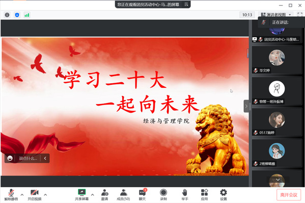为深入学习宣传贯彻党的二十大精神,庆祝党的二十大顺利召开,加强经济与管理学院青年学生的思想政治引领,进一步引导经管学子继承和发扬伟大建党精神,永远跟党走,奋进新征程。经济与管理学院组织2022级学生于10月31日线上开展“学习二十大,一起向未来”主题团课活动。