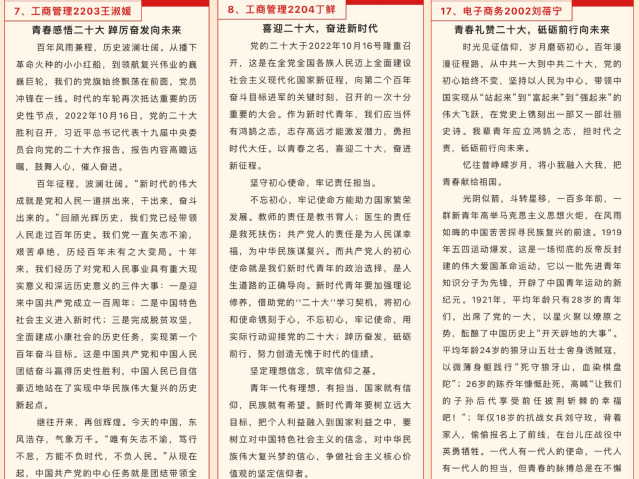 为深入学习贯彻党的二十大精神,大力弘扬以爱国主义为核心的伟大民族精神,引导经管学子铸牢奋斗思想、增进爱国情怀,不断提高政治觉悟和理论修养,以饱满的热情庆祝党的二十大胜利召开。经济与管理学院于10月25日-11月17日举办了以轻青小课堂——“青春献礼二十大 踔厉奋发向未来”为主题的征文手抄报比赛。