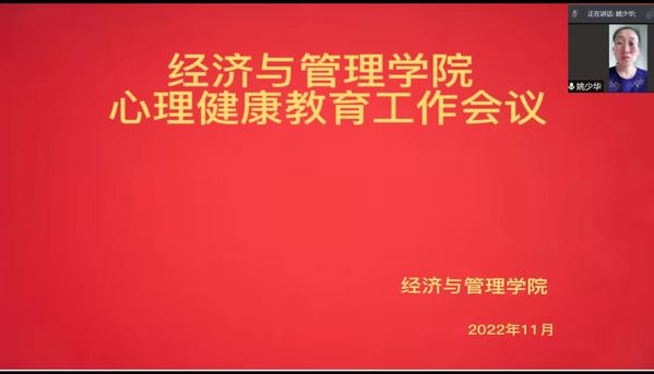 为扎实推动学院心理健康教育工作的深入开展,着力提升我院心理健康教育工作管理水平,增强学院心理健康工作的针对性和实效性,密切关注静态化管理下大学生的心理健康状况,使同学们保持良好心态,经济与管理学院于2022年11月17日线上举办了心理健康教育工作会议。经济与管理学院党委副书记陈章美,心理健康教育专职辅导员姚少华,学院心语工作室全体成员及学院各班心理委员参加了本次会议。