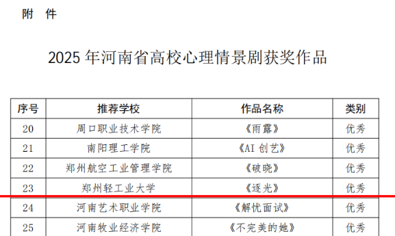 近日,中共河南省委教育工委办公室、河南省教育厅办公室发布《关于公布全省高校心理情景剧遴选结果的通知》(教办思政〔2025〕539号),我校心理健康教育中心指导、电子信息学院师生团队参演的心理情景剧《逐光》被评为河南省高校心理情景剧优秀作品。
