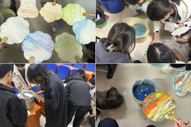 10月18日晚上,嵌入式软件2024级3班团支部举办了“扇舞心韵:漆扇创意拓展之旅”的心理活动。活动前,班委投影播放漆扇文化短片,从古代文人扇面题诗到现代漆扇工艺创新,趣味故事吸引同学们专注聆听。在创作环节,心理活动室化身创意海洋。同学们或低头沉思构思路径,或围坐交流色彩搭配,男生用色比较大胆,女生们则偏爱清新雅致的风格。高可盈同学作品以枫叶形扇为基底,调配黄、蓝、粉色,最终一个淡雅清新的漆扇从水里出来。作品完成后,大家各自向同学展示自己的成品,教室里充满了笑声和夸奖。