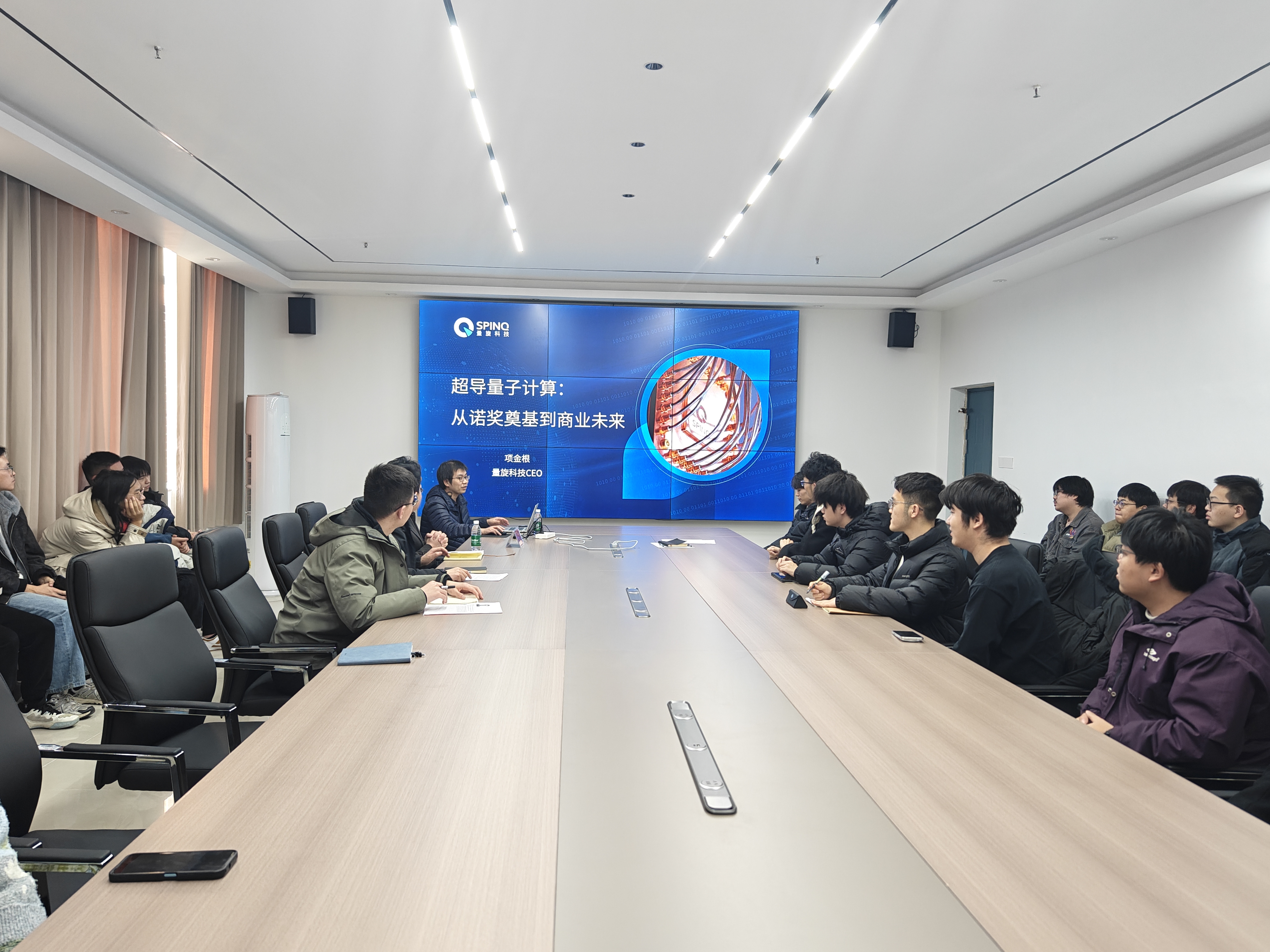 座谈会上,冯学超对项金根博士一行的到访表示热烈欢迎,介绍了学院在量子信息科学专业实践平台建设、拔尖创新人才培养体系构建等方面的成效。项金根博士介绍了深圳量旋科技的成立背景、发展现状及量子技术产业化应用成果。希望以此次交流为契机深化校企合作,在量子信息领域专业人才培养、实践平台共建等方面实现资源共享、互利共赢。在专题报告环节,项金根博士以《超导量子计算:从诺奖奠基到商业未来》为题,系统梳理了量子计算的理论基础与发展脉络,深入浅出地讲解了其产业化进展与前沿应用方向。报告为师生带来了量子科技领域的前沿视野,也为专业人才培养路径提供了有益借鉴。