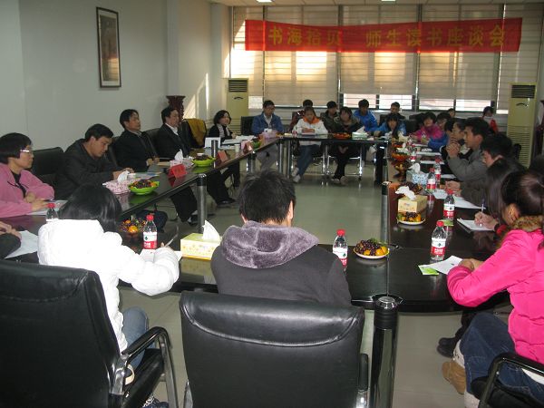 2013年11月28日下午,“书海拾贝”师生读书座谈会在学校第三会议室召开,副校长陈江风教授出席了座谈会,党委办公室主任陆相欣教授、计算机与通信工程学院尹毅峰博士、图书馆相关老师及30多名学生代表参加了交流会。档案馆馆长兼图书馆副馆长蔡丽萍主持了座谈会。
