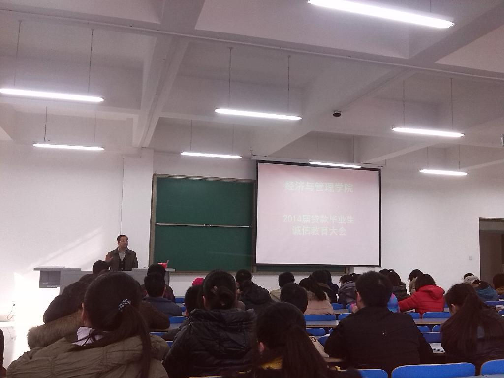 为加强学生诚信意识的树立,帮助学生明确还款程序,1月3日上午11点,经济与管理学院在科学校区经管楼309室举行了2014届毕业贷款学生诚信教育大会。经济与管理学院党总支副书记刘洪民、负责贷款的王静老师、2014届贷款毕业生参加了此次会议。