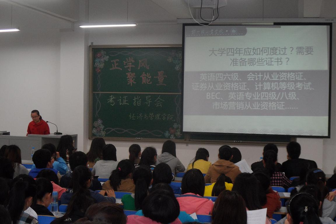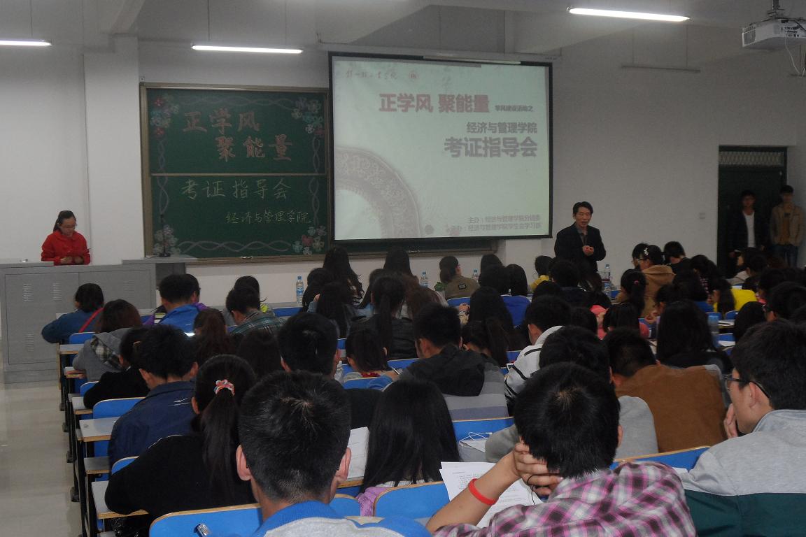 为了营造良好的学习氛围,帮助同学们树立正确的学习态度,激发学习的热情,同时帮助准备考证的同学明确学习目标及方法,解决在考证中遇到的困惑,4月3日下午2:00,经济与管理学院在经管楼309成功举办了“正学风聚能量”学风建设活动—考证指导会。