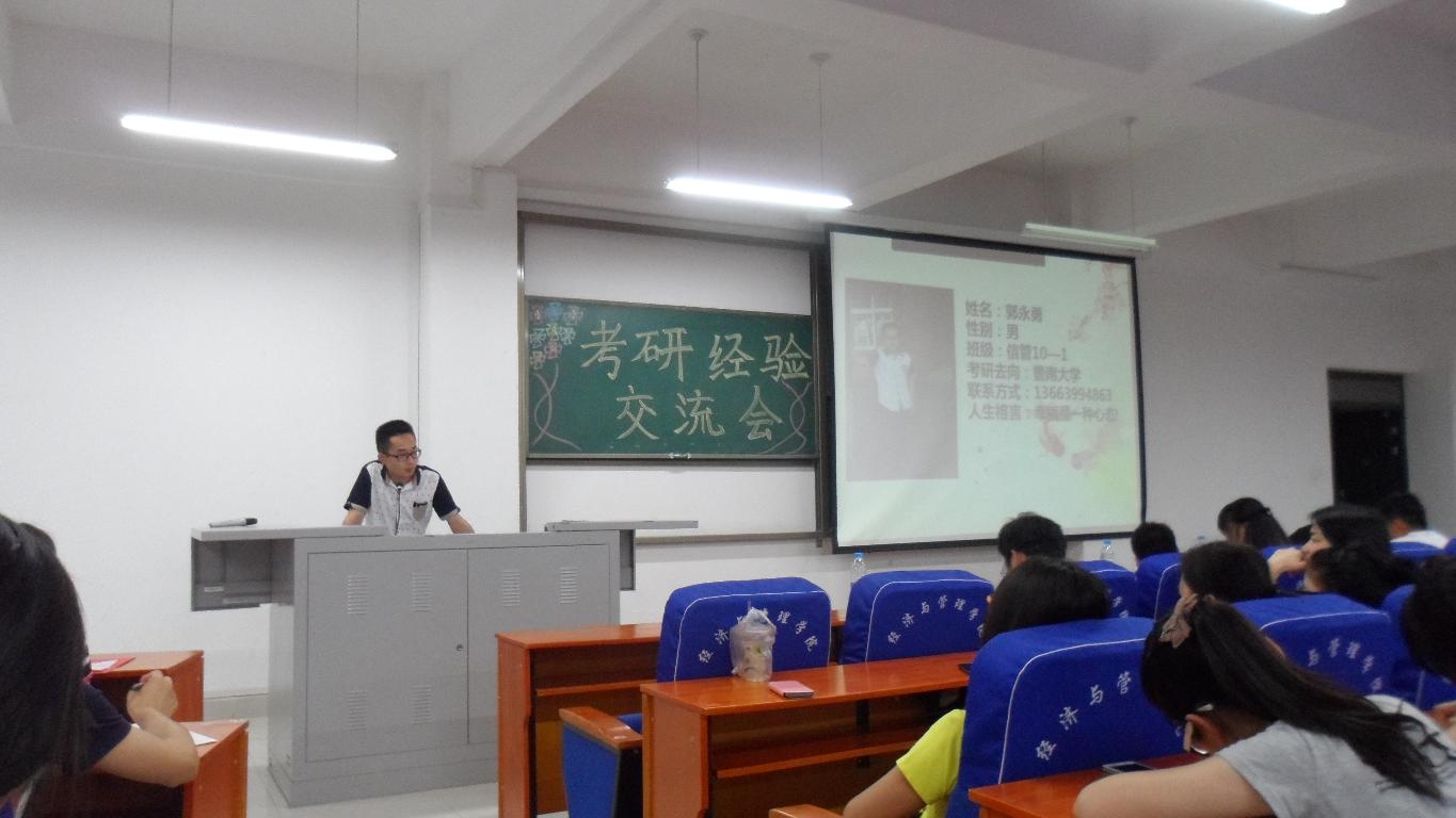 为进一步营造我院同学的考研热情,明确考研目标,掌握相关考研技巧和考研信息,5月29日晚,经济与管理学院在经管楼211举办了考研经验交流会。