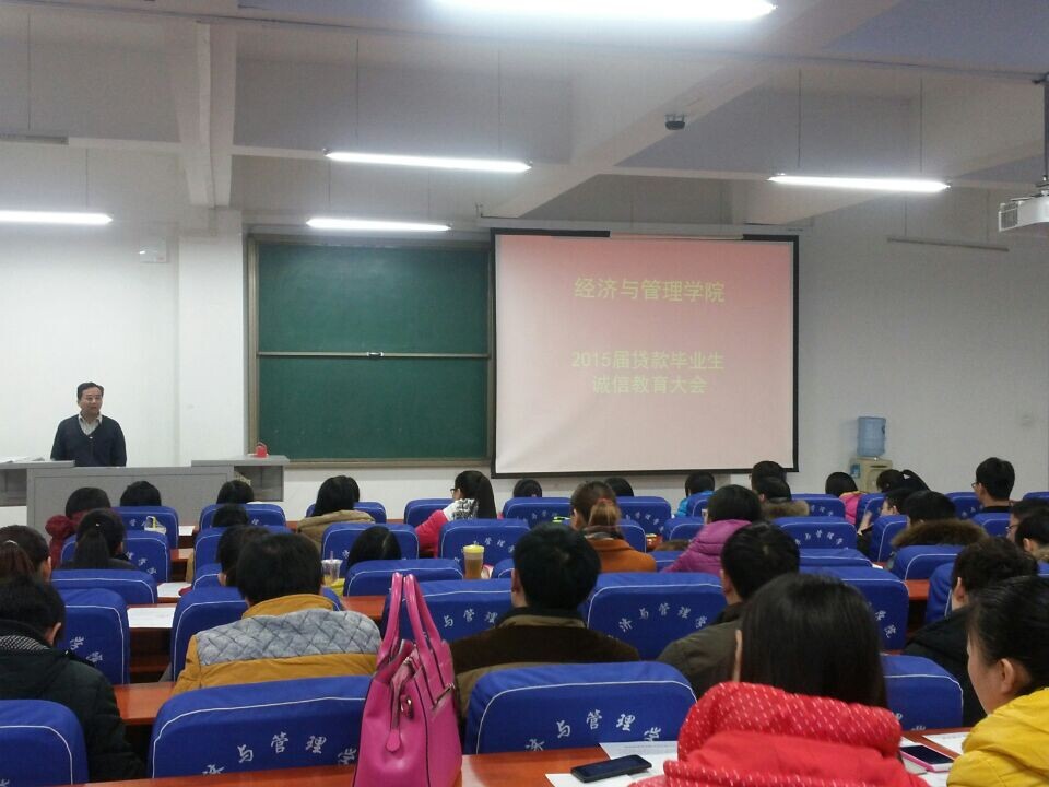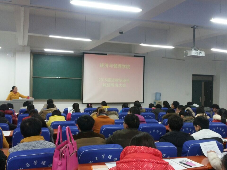 为加强学生诚信意识的树立,进一步做好2015届毕业生贷款工作, 1月8日上午10点,经济与管理学院在科学校区经管楼211室召开“2015届贷款毕业生诚信教育大会”,党总支副书记刘洪民、负责贷款的王静老师以及2015届贷款毕业生参加了此次大会。