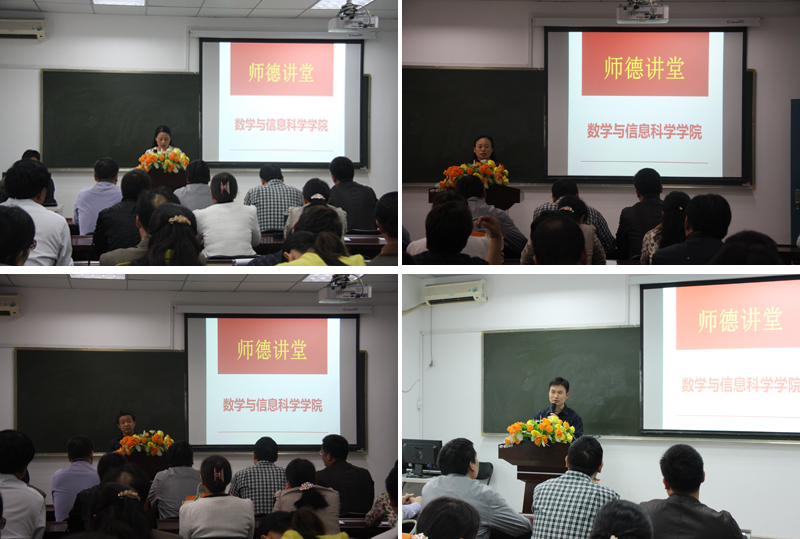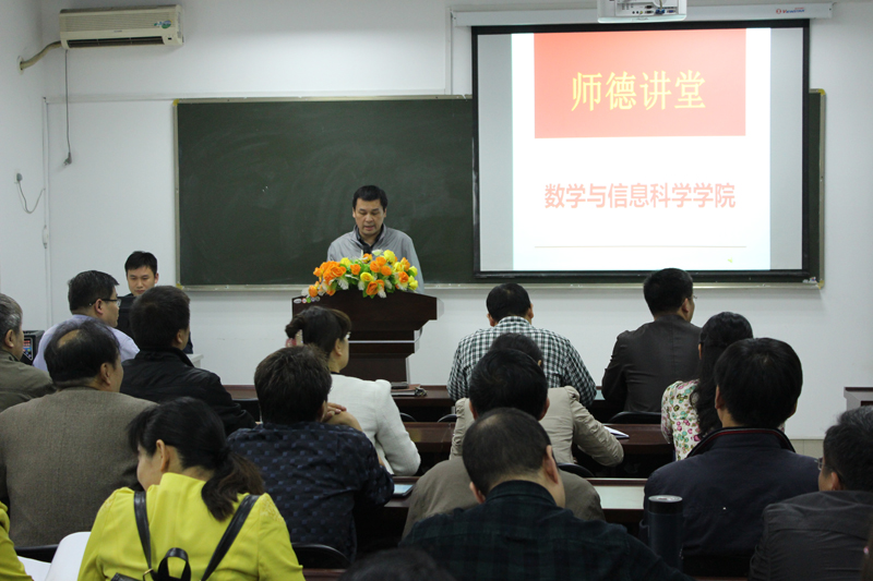 为认真贯彻落实我校关于师德师风建设的相关要求,进一步弘扬高尚师德,传承师德精神,深入推进我院师德师风建设和精神文明建设,经过精心的策划和准备,5月7日下午,数学与信息科学学院在东风校区东一楼216室成功举办了以“弘扬高尚师德 传递教育正能量”为主题的“师德讲堂”活动。数学与信息科学学院全体教职工参加了此次活动。