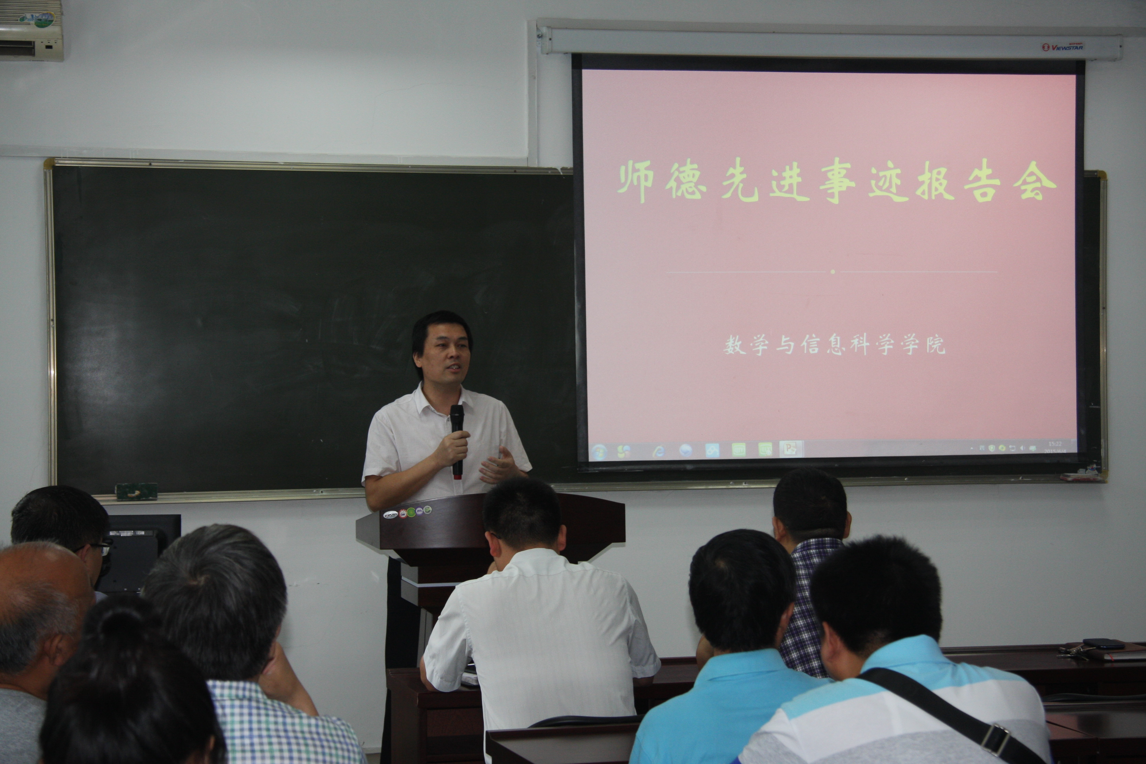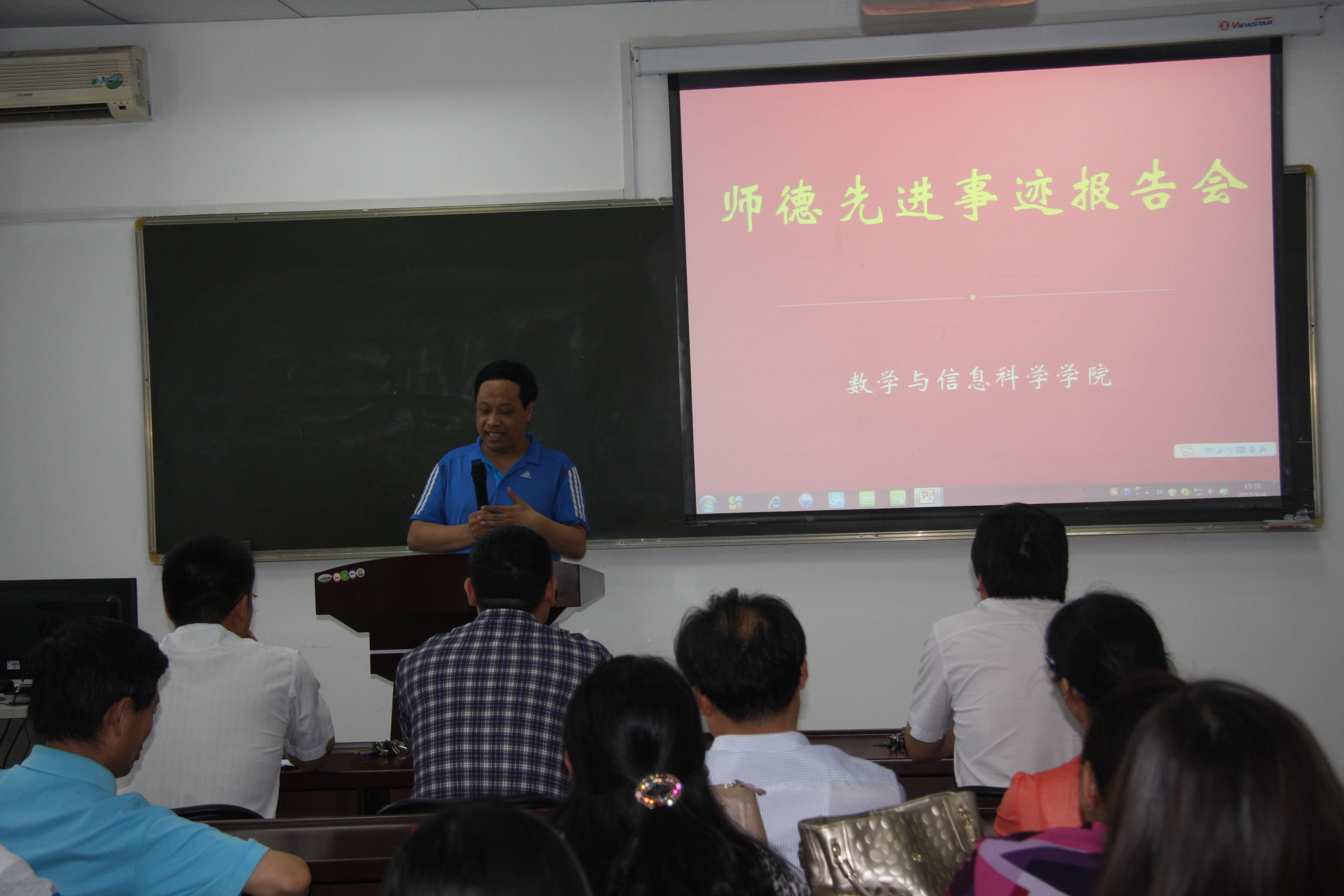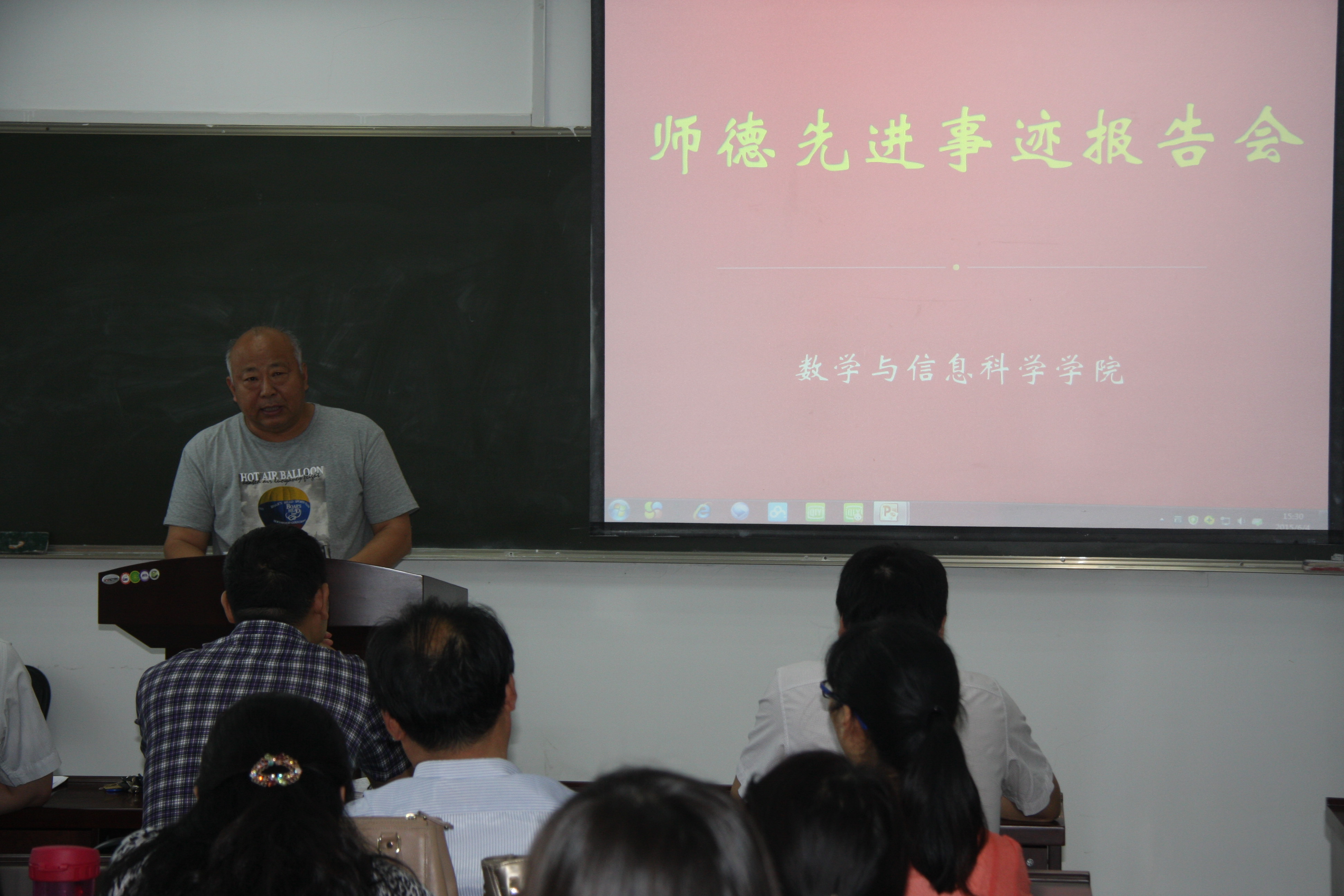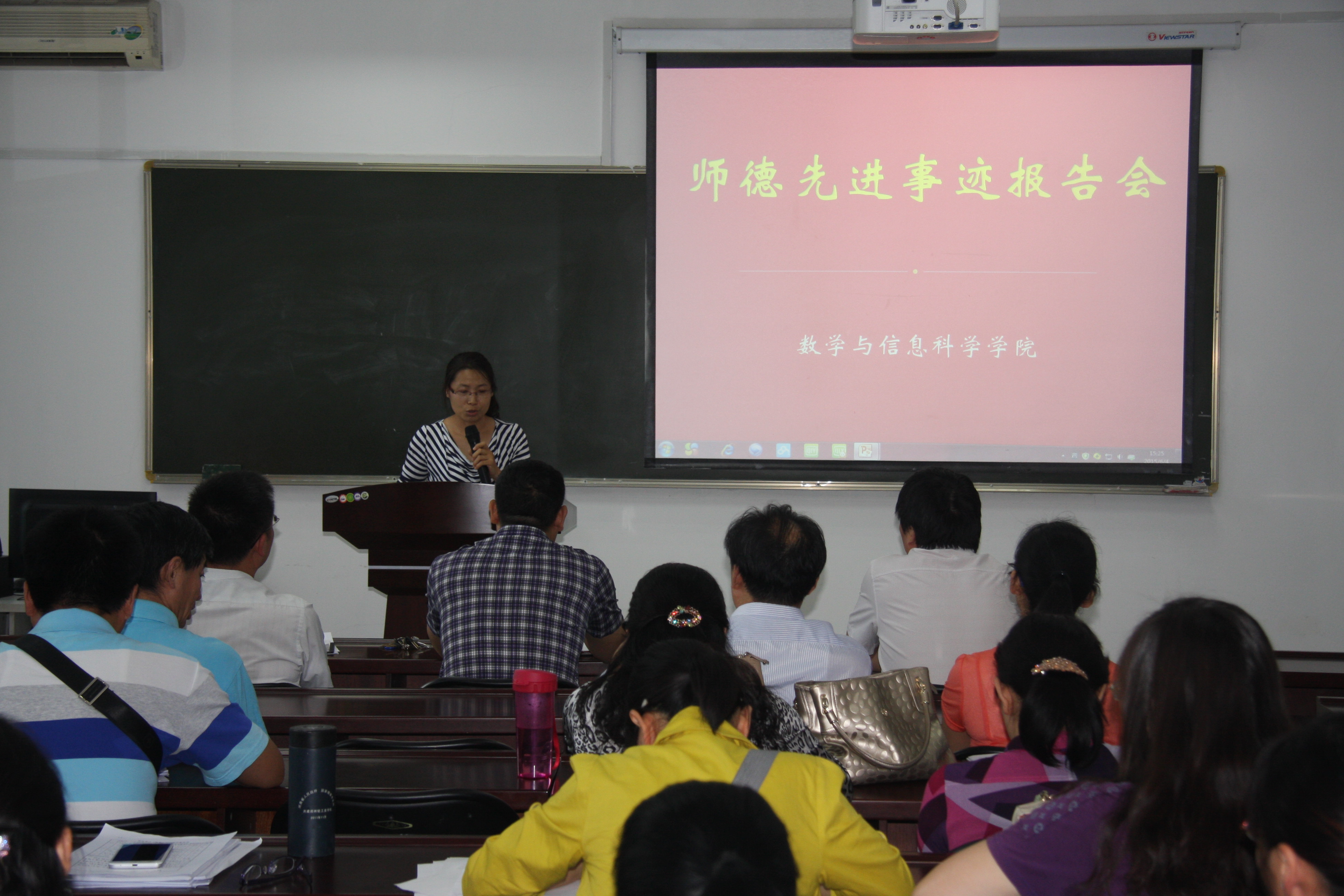 为了进一步深化师德师风建设,积极创新师德师风建设的方式和方法,巩固师德师风建设的成果,数学与信息科学学院6月4日在东一楼216会议室举行了师德先进事迹报告会。报告会由数学与信息科学学院党总支书记黄守佳主持,师德先进个人裴云霞、张银鹤、郭卫华分别作了个人先进事迹报告,全体教师参加会议。