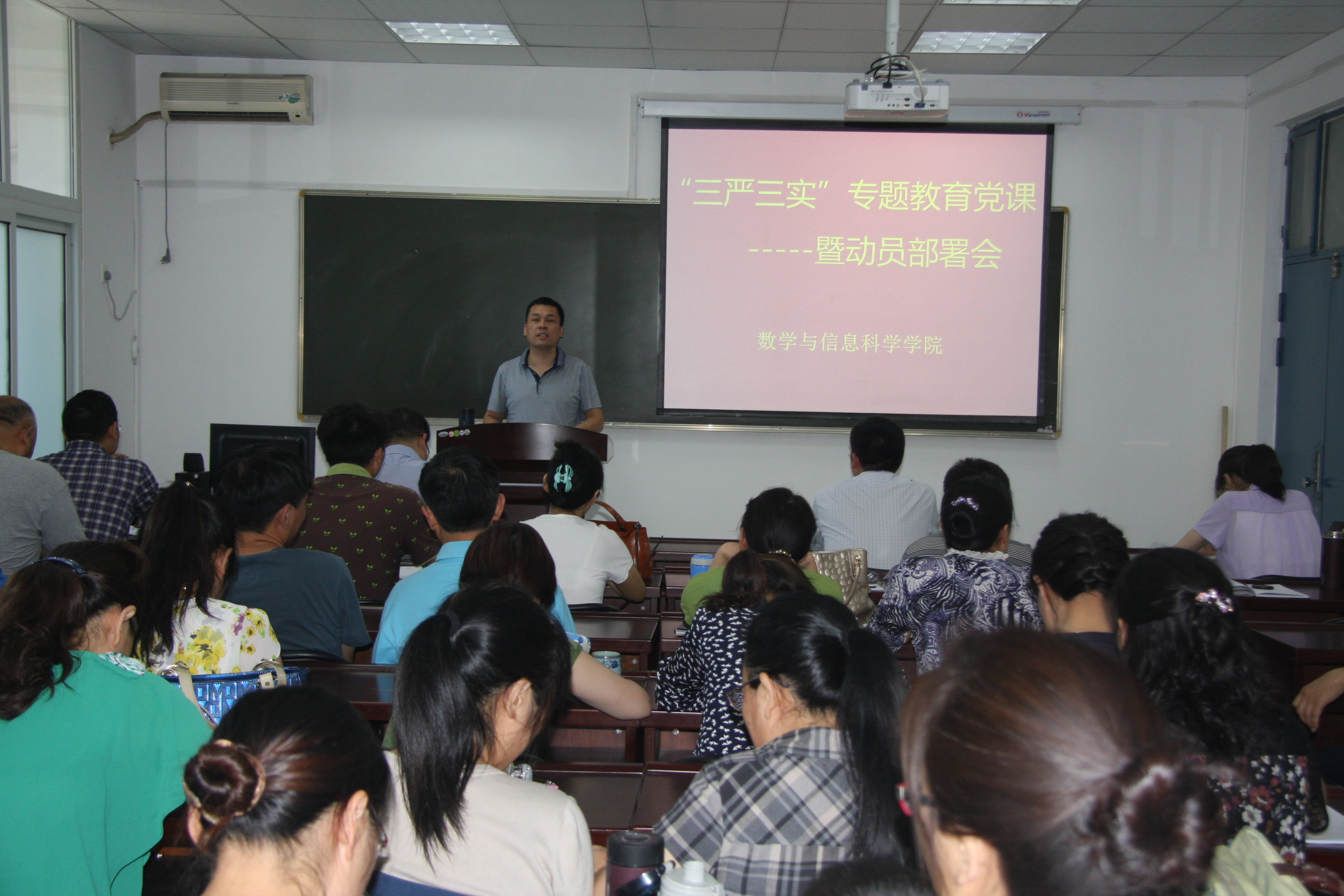 6月11日下午,数学与信息科学学院在东一楼216会议室召开“三严三实”专题教育动员会暨专题党课。学习“三严三实”专题教育有关精神,安排部署我院“三严三实”专题教育。院领导班子成员、全体教师及部分学生党员代表了动员部署会。