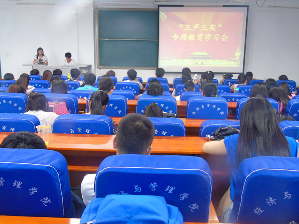 为全面贯彻落实习近平总书记提出的“严以修身、严以用权、严以律己,谋事要实、创业要实、做人要实”的重要精神,6月19日中午,经济与管理学院学生党支部在经管楼211举办了“三严三实”主专题教育学习会。我院全体学生党员和部分入党积极分子参加了本次专题学习会。