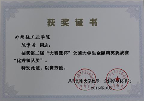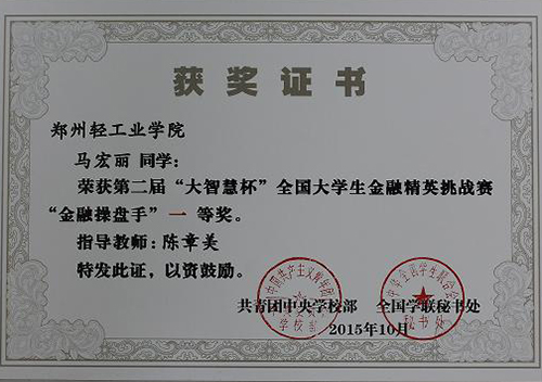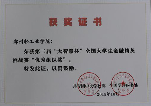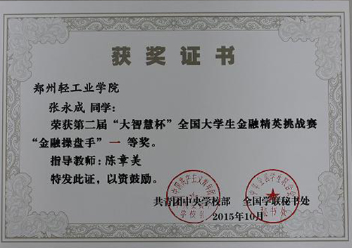 日前,由共青团中央学校部、全国学联秘书处主办、上海大智慧股份有限公司承办的第二届“大智慧杯”全国大学生金融精英挑战赛圆满落下帷幕。我校学生获得全国高校金融操盘手一等奖2名,二等奖9名,三等奖81名,校团委王燕翔、经济与管理学院陈章美荣获“优秀领队奖”,学校荣获“优秀组织奖”。