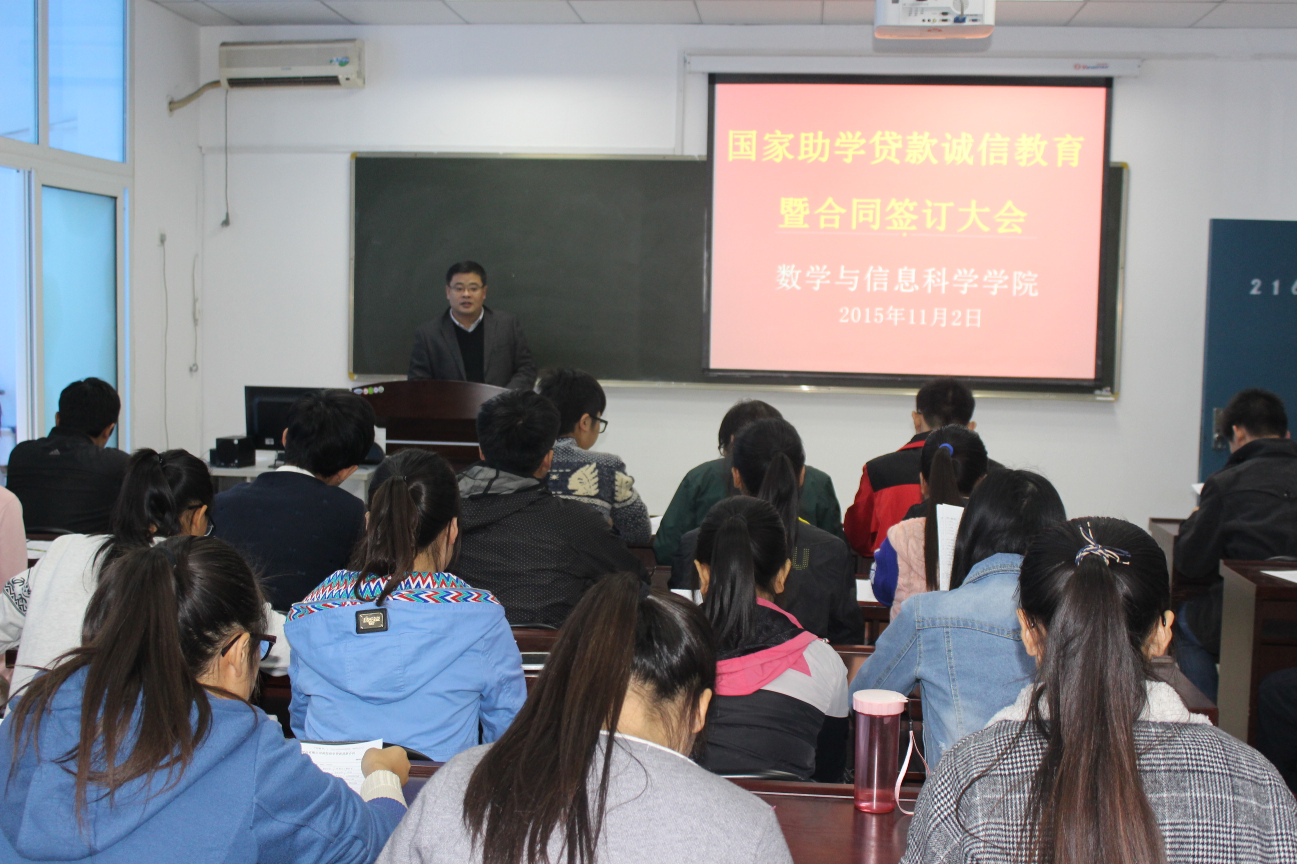 11月2日中午,数学与信息科学学院在东一楼216召开国家助学贷款学生诚信教育大会暨合同签订仪式。院党总支副书记张阳老师、负责资助工作老师以及本学年贷款学生参加了会议。