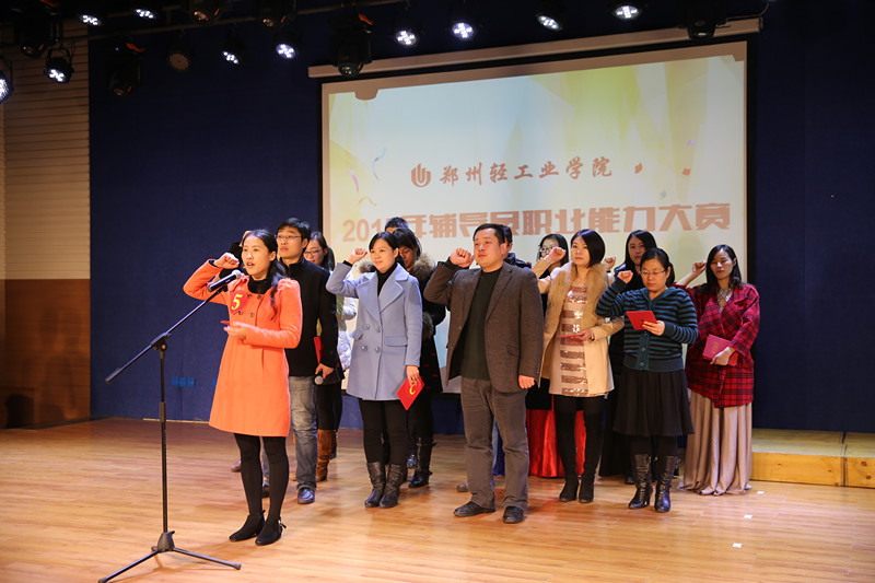 本届大赛从赛前动员发布预通知、赛前培训、预赛到决赛,历时近5个月。各学院精心推荐,辅导员积极参赛。参赛选手通过基础知识测试、“两微”大赛、现场主题班会、案例分析、主题演讲和谈心谈话等比赛方式,展示了工作技能、交流了工作经验,彰显了个人特色,达到了以赛促学、以赛代练、以赛促训的目的,集中展现了我校辅导员爱岗敬业、昂扬向上的精神面貌和良好的职业素养。经过各环节的激烈角逐,最终食品与生物工程学院王楠获一等奖,艺术设计学院贾红雨、外国语学院刘振卫、国际教育学院焦云娜获二等奖,政法学院刘栩静等四位辅导员获三等奖,经济与管理学院宋正凯等9位辅导员获优秀奖。王楠获得最佳现场班会奖,欧阳杜鹃获得最佳新人奖。比赛中,穿插了6位辅导员老师现场演唱《辅导员之歌》,引爆了现场气氛,赢得师生阵阵掌声。活动最后,由大赛一等奖获奖者王楠领誓,全体专兼职辅导员重温了《辅导员誓词》。