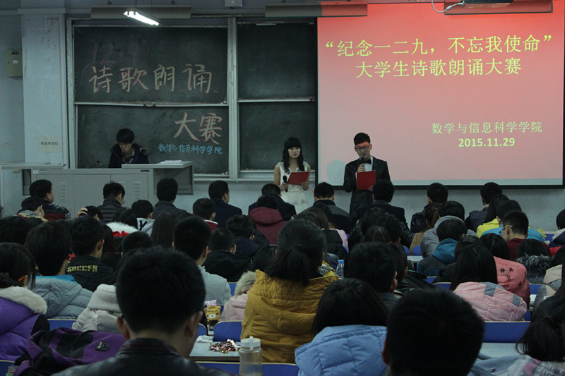 为纪念“一二·九”运动80周年,加强青年团员的思想教育,使广大团员明确青年人肩负的历史责任,发奋学习,报效祖国。11月29日下午,数学与信息科学学院在东一楼218室举办了以“纪念一二九,不忘我使命”为主题的诗歌朗诵比赛。