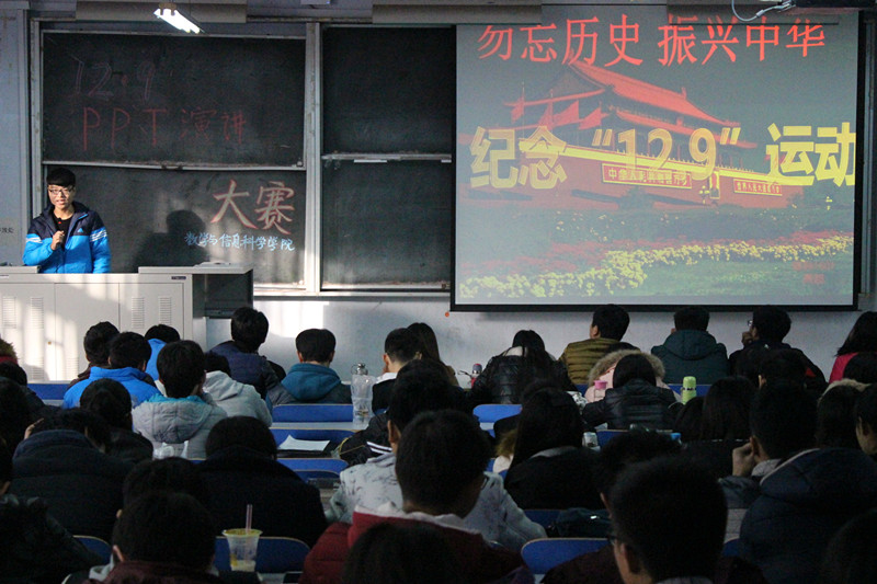 为纪念“一二•九”运动,激发同学们的爱国情怀,不断坚定自己的理想信念,近日,数学与信息科学学院在全院学生中组织开展纪念“一二•九”运动80周年PPT演讲大赛。