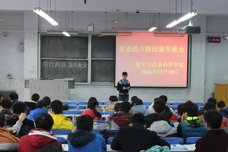 值四、六级考试临近之际,为了增加我院同学对英语四、六级考试规则的认识,提高同学们考试的解题技巧,同时缓解考前的压力,以积极的心态面对英语四、六级考试,数学与信息科学学院于12月10日上午在东一楼218成功举办英语四、六级考试经验交流会。