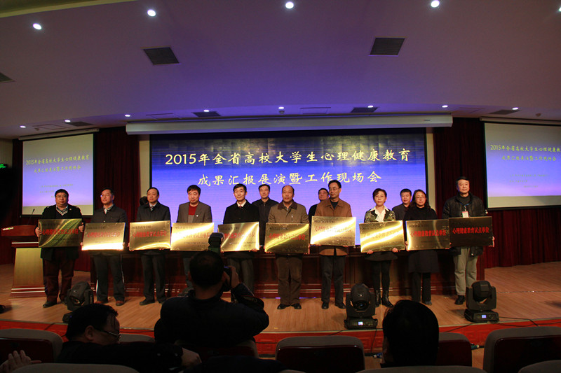本次会议主要开展了全省高校心理健康教育试点单位成果展演、实地观摩、集中授牌仪式和工作经验交流等活动,并对下一步的工作进行了安排和部署。省委高校工委专职委员陈垠亭宣读了《关于公布第三批普通高等学校心理健康教育试点单位的通知》,我校作为第三批心理健康教育试点单位十所之一名列其中。在成果展演中,我校选送的心理情景剧《疯狂时代》参加了成果汇报展演,该剧诙谐幽默又极具心理健康教育意义,获得现场观众一致好评。