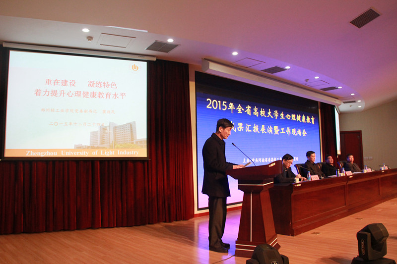 12月24日上午,全省高校大学生心理健康教育成果汇报展演暨工作现场会在河南省中医学院举行。省委高校工委副书记、省教育厅副厅长张亚伟,省委高校工委专职委员陈垠亭、省教育厅思政处处长何秀敏等领导、全省三批心理健康教育试点单位的学校领导和100多所高校的学生工作部部长、心理健康教育中心主任近300人参加会议。会议由何秀敏主持。校党委副书记窦效民代表我校作为第三批试点单位的唯一代表在本次会议上做了典型发言。