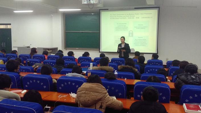 陈教授以马云的成功案例开篇,诙谐的语言直入主题,他就管理的商业模式方面给出了独到的分析,他主张要做到“价值,资源,过程及利润”四方面的协调。其次,以“创新”为论点探讨现今发达社会“颠覆性技术的应用与发展”的普遍性,以及如何可以成功创新等有关问题。最后,陈岳云教授结合了自身在教学中的实践经历讲述了“市场竞争的战略性”等相关知识,并且与在场的老师和同学们展开了精彩的互动。