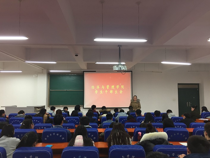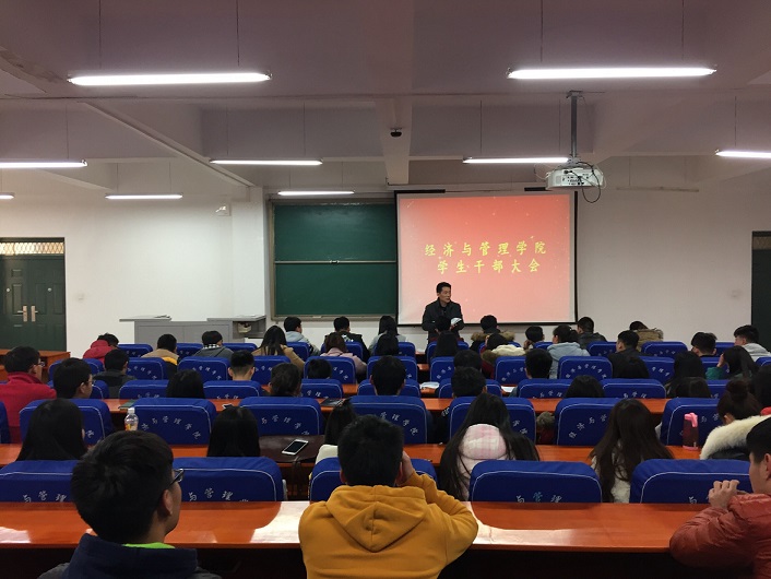 2月28日下午4点半,经济与管理学院在经管楼211教室召开学生干部大会,会议安排了新学期团学工作。学院党总支副书记陈章美、分团委老师和学生会、年级团总支全体学生干部参加大会。大会由经济与管理学院分团委书记姚少华主持。