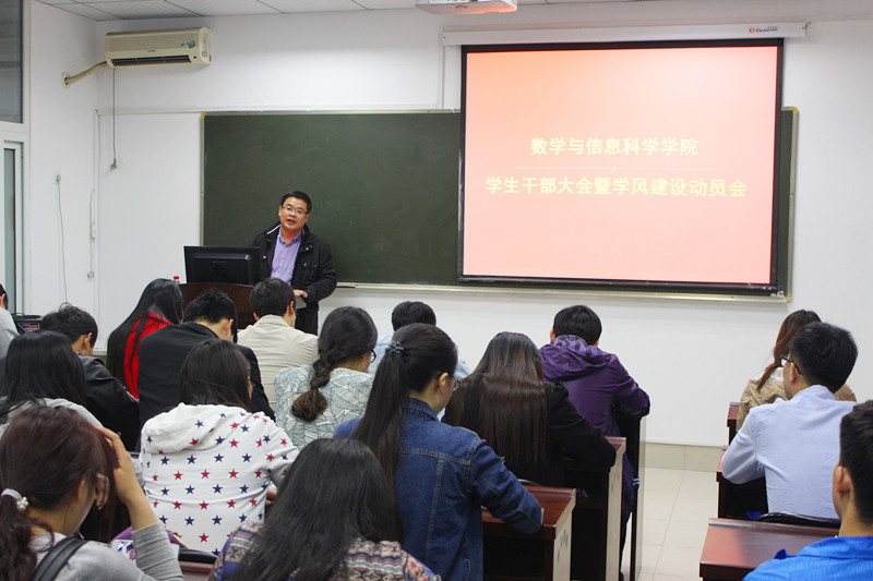 为形成有利于学生全面发展的优良学风,营造良好的育人环境,3月28日晚上,数学与信息科学学院在东风校区东一楼216召开了全体学生干部大会暨学风建设动员会。院党总支副书记张阳老师、辅导员老师参加了本次会议。