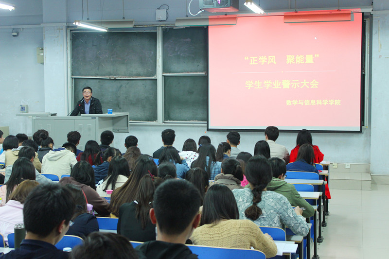 为加强学风建设与管理,让学生进一步明确学习目的,尽快摆脱学业危机,顺利完成学业。3月28日晚7:30分,数学与信息科学学院在东一楼218召开“正学风 聚能量”学生学业警示大会,党总支副书记张阳、各年级辅导员参加了会议。