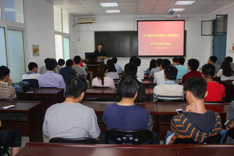 为了帮助2016届毕业生清醒认识当前严峻的就业形势,引导和帮助毕业生树立正确的择业观和就业观,指导毕业生正确择业,5月6日上午,数学与信息科学学院在东一楼216会议室召开2016届毕业生就业工作推会,学院党总支副书记、就业负责人及2016届全体毕业生参加了此次会议。