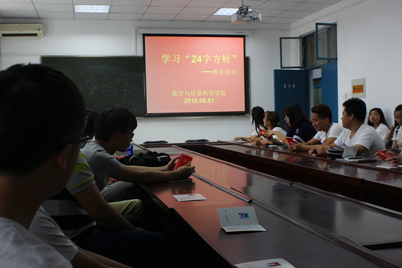 为了积极响应我校关于“践行社会主义核心价值观”的号召,6月1日中午12:40,数学与信息科学学院举办了以“践行社会主义核心价值观”为主题的团日活动。本次活动由焦家栋同学主持,第55期全体入党积极分子参加了此次活动。