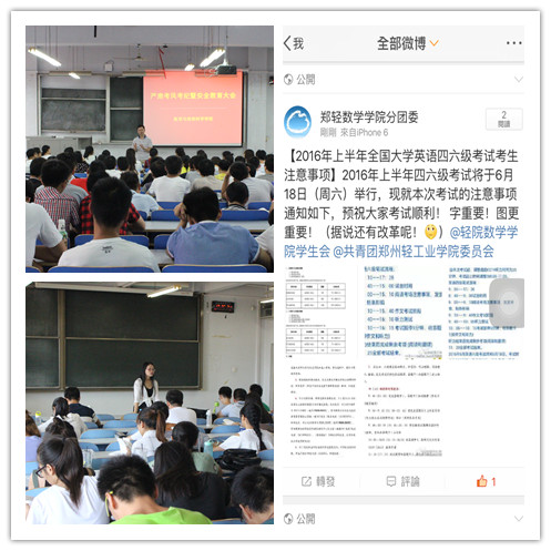 首先,学院党总支副书记在学生会议上强调:“临近期末,希望各班级在复习迎考的这段时间里,能够认真对待期末考试,认真复习,把功夫用在考前。严肃考场纪律,端正考风,树立良好学风。”其次,在各年级班会上,辅导员老师针对《郑州轻工业学院学生违纪处分管理规定》中与考试有关的条款结合违纪案例对广大同学进行教育,要求全体同学要严格遵守考场规则、考试纪律及年级有关规定,积极充分备考,杜绝舞弊行为,维护公平、公正,争做文明诚信大学生!此外,学院还通过QQ群、短信、学院微博、微信公众平台向全体同学推送学院“关于严肃考风考纪的通知”,帮助同学们树立诚信意识。